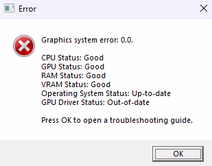 If you see a graphics error message when starting the game, the game's Vulkan renderer failed to start properly. The lines in the error message can help you identify the potential causes. In the example below, the CPU, GPU, RAM, VRAM, and OS all meet the minimum specs, but the graphics driver appears to be out of date (generally more than a year old). Updating your graphics drivers may help fix the issue.